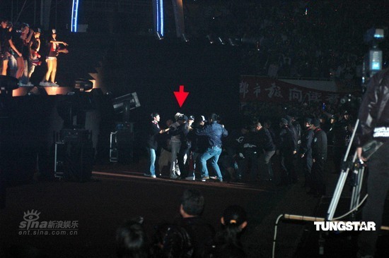 他从2.2米高的舞台跳下去,大力推开保安,大声说:不准打他,他是我的歌迷,他只是送花,不会有恶意的。你们放开他。